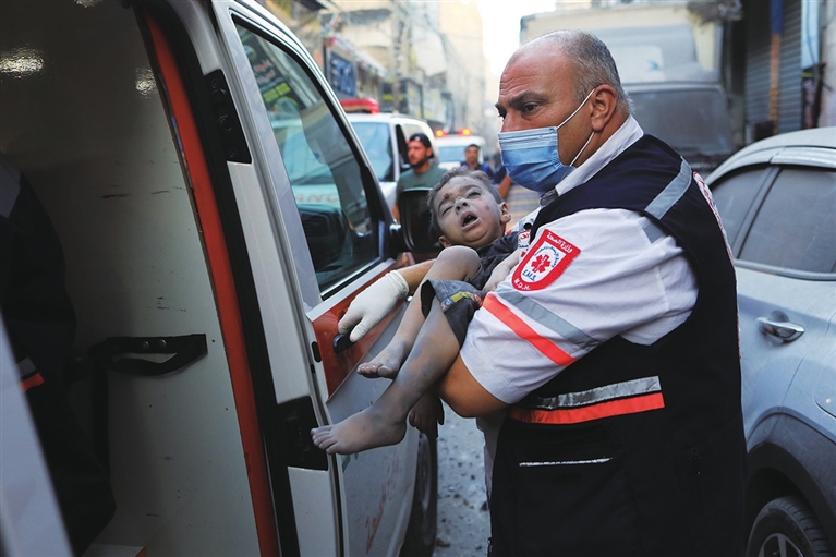 10月19日,在加沙地带南部城市汗尤尼斯,人们在遭以色列空袭后的建筑废墟中救援伤者。