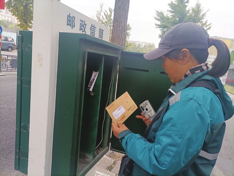 下午2点多,在青年路北口的绿色邮筒前,投递员陈维提着一串钥匙准时出现,她驾轻就熟地打开邮筒盖,探头仔细查看。1封信,静静地躺在里面。在她看来,就像是一个不期而遇的老朋友。