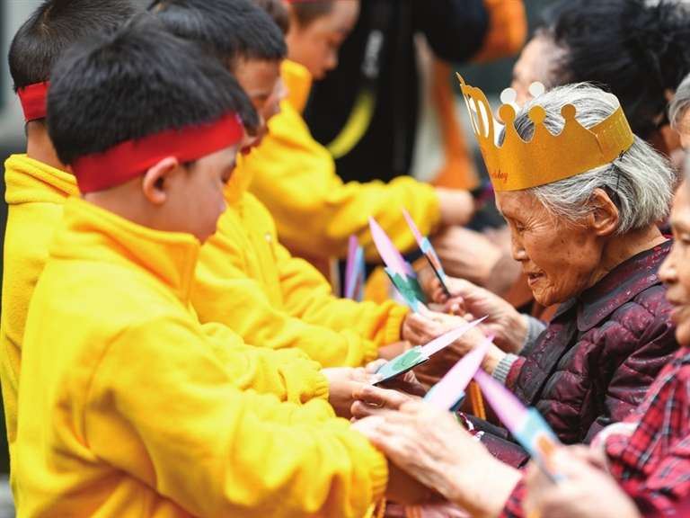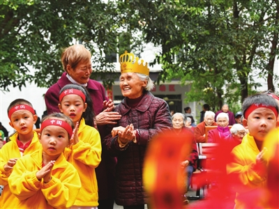 10月20日,在四川省眉山市彭山区社会福利院,彭山区幼儿园的小朋友一起为赵凤章老奶奶祝寿。