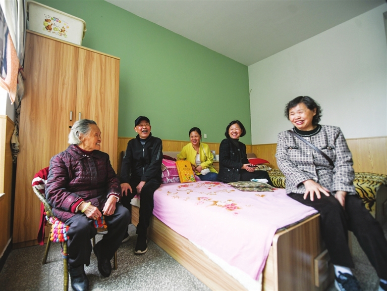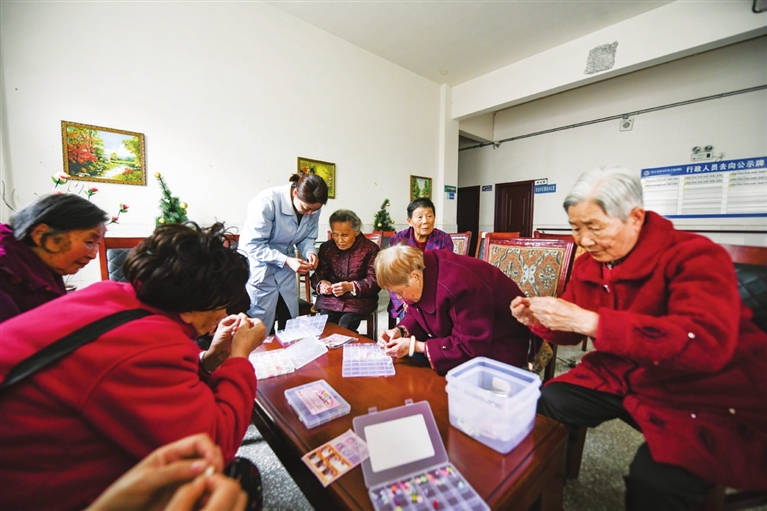 赵凤章老奶奶(右四)和福利院其他老人一起学做手工。