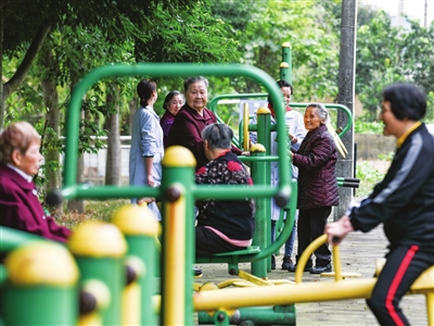 10月20日,在四川省眉山市彭山区社会福利院,赵凤章老奶奶(右二)在福利院工作人员陪同下锻炼身体。