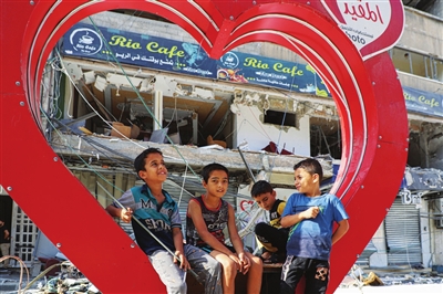 10月22日,在加沙地带南部城市汗尤尼斯,几名儿童坐在一处心型设施上,身后是遭以色列空袭损毁的建筑。