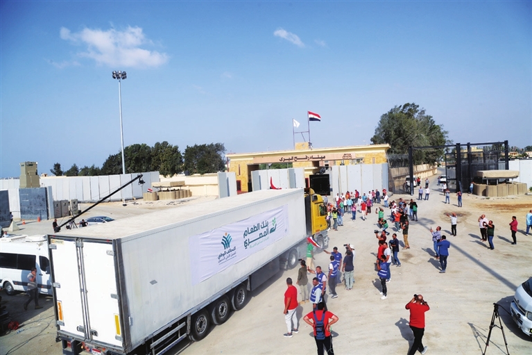 以色列和巴勒斯坦本月7日以来爆发新一轮军事冲突,造成大量人员伤亡。21日,首批20辆装载人道救援物资的卡车从拉法口岸埃及一侧进入加沙地带。