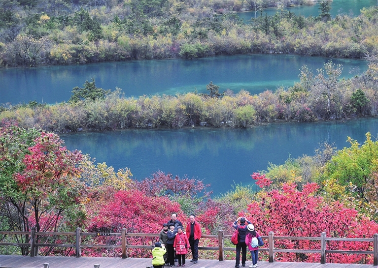 深秋时节,世界自然遗产地九寨沟正值一年中最美的“色彩旺季”,美丽景色宛若童话世界,吸引游客前来游览。