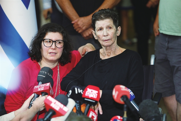 10月24日,获释的以色列被扣押人员约赫韦德·利夫希茨(右)在以色列特拉维夫接受采访。