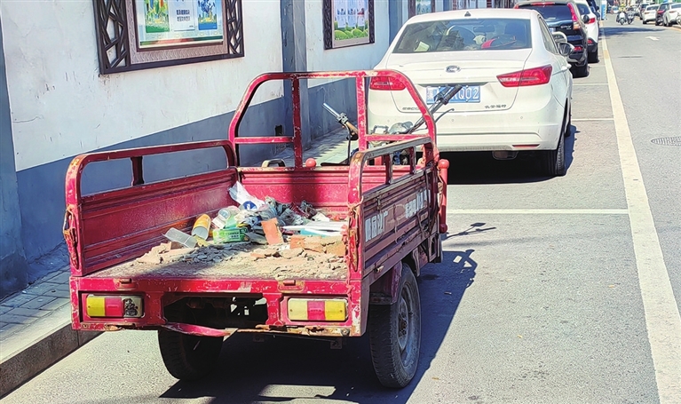 10月24日,记者在精营西边街看到,路西公共停车位内停着一辆十分破旧的三轮车,该车车斗内满是垃圾和杂物,十分影响市容市貌,希望相关部门尽快处理。