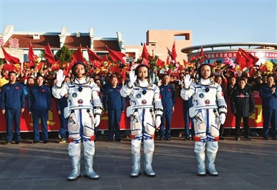 此刻,记者定格了一张照片:杨利伟和3名航天员相互挥手致意。而杨利伟的身后,12个大字格外醒目:再次出征、再夺胜利、再创辉煌。