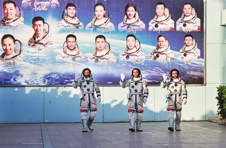 10月26日上午,身着乳白色舱内航天服的3名航天员,在万众瞩目下,从酒泉卫星发射中心问天阁出征太空。