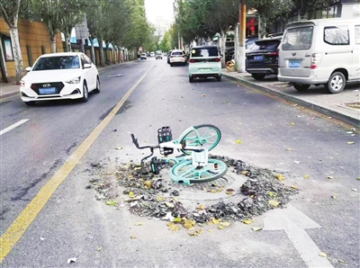拍摄经过:10月26日,我途经长风南街二巷与学府街交叉口时,看到往北十余米的道路中间,一辆共享单车横倒在一个井盖上。原来,这个井盖周围刚用水泥进行硬化,放置共享单车应该是用来提醒路人绕行。不过,施工应放置专业警示标识和设施,用共享单车作为警示标识,实在影响市容市貌。