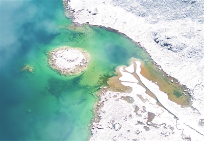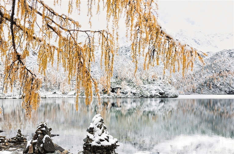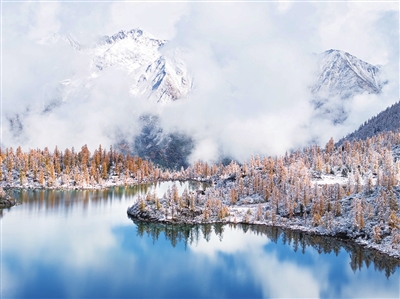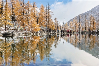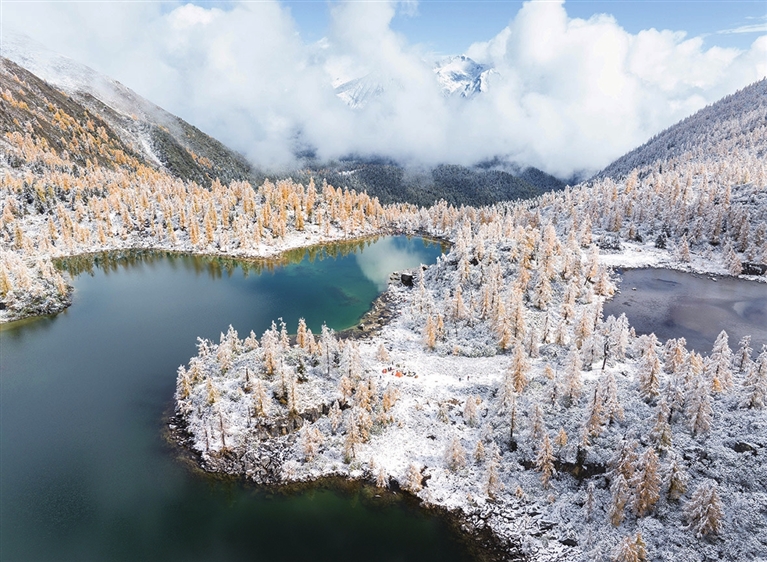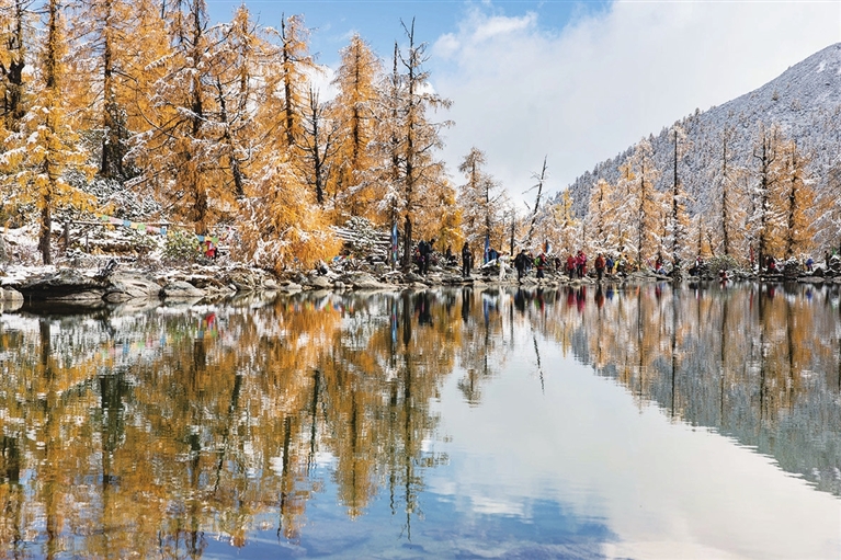 10月27日,雪山、蓝天白云和党岭村葫芦海、彩林构成一幅优美的画卷。