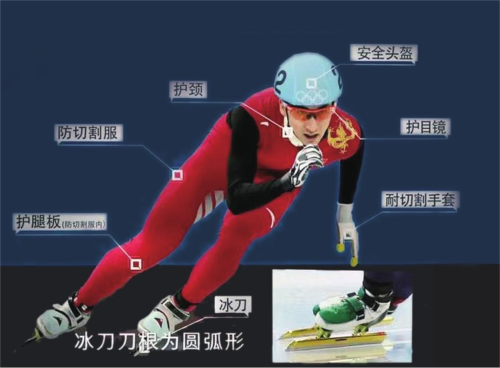 因此,短道速滑比赛都对运动员的服装有严格要求,运动员的防护服是用特殊纤维制成的,其原料与防弹背心所用的相同,冰刀割不破。此外,运动员还必须穿护膝、护胫、护颈,戴头盔,尤其是护颈和头盔,可以最大限度避免出现生命危险。