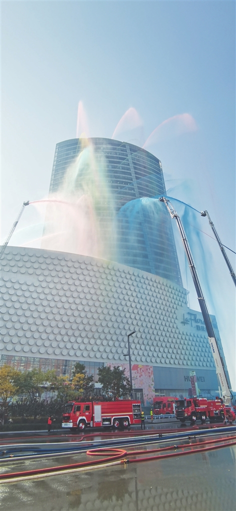 与此同时,72米登高平台车、70米高喷车也迅速展开,两条水龙居高临下,直扑写字楼东北侧及西北侧的明火。室内灭火救援情况通过现场大屏幕直播,人们可以清晰地看到,购物中心7层着火区,救援人员利用水枪依托分隔设施对蔓延火势进行堵截。同时在蔓延方向设置灭火机器人和移动水炮,采用无人化作战的方式提升灭火强度,确保救援人员安全。