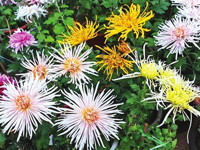 漫步在迎泽公园和晋祠公园的菊园,你会陶醉在各种颜色的菊花中。五颜六色的菊花,在绿树蓝天的衬托下,红的似火,紫的似霞,白的如晶莹的珍珠,黄的似点点金星。它们三五朵开在一起,竞相争艳。