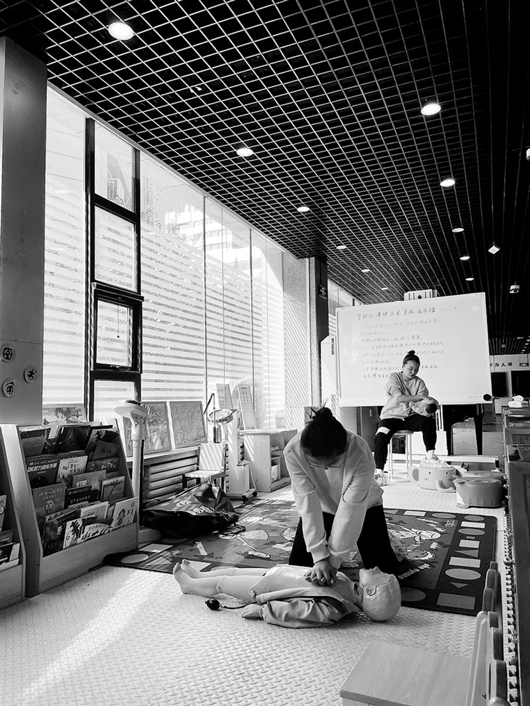 色彩淡雅的地垫靠着落地窗铺设,几十把小椅子有趣可爱;约一米高的木架上,绘本、玩具、奥尔夫乐器等次第排开,手工绘画作品琳琅满目……步入学前教育学院的校内实训基地,就像来到了敞亮温馨的托育园所。实训基地内,几位学生正专注地各自练习。一名学生跪在CPR(心肺复苏术)专用模拟娃娃旁,为“他”做着心肺复苏。不远处,另一名学生将颜色形状不同的积木分成几堆,微笑着示范讲解,仿佛面前正坐着一排懵懂幼儿。
