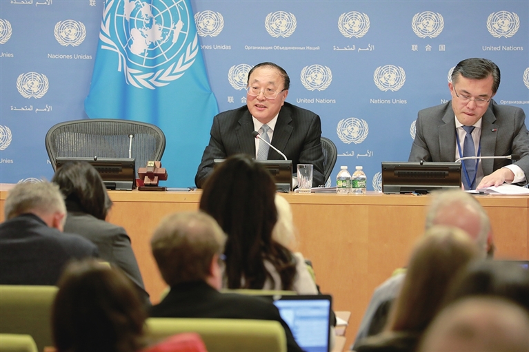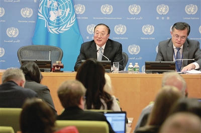 11月1日,在位于纽约的联合国总部,中国常驻联合国代表张军(左)在媒体吹风会上讲话。 新华社 发