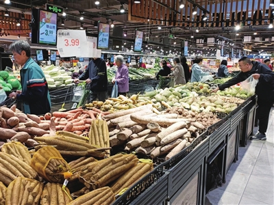 10月31日是美特好冬储菜集中售卖的最后一天,除了大葱、土豆、白菜等传统冬储菜,很多市民开始丰富冬储菜餐桌——铁棍山药、红心红薯、板栗南瓜等也加入了冬储菜的行列。王燕趁中午下班过来逛超市:“我买了一些山药和南瓜,过几天还想买点大蒜和萝卜,都不是用来腌制,而是蒸煮、炒制,也不会动辄上百斤地买,就是趁着搞活动各种菜都买点。当然冬天里一锅热乎乎、软烂烂的大烩菜是我们一家的最爱。”