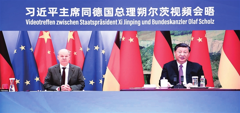 习近平强调,当前国际形势正在发生很大变化,地缘冲突加剧,经济复苏乏力,冷战思维回潮。中国和德国都是负责任的大国,不仅要发展好双边关系、做合作共赢的表率,更要捍卫国际秩序和多边主义,携手应对全球性挑战。中欧关系关乎世界格局稳定和亚欧大陆繁荣,值得双方全力维护好、发展好。中国将欧洲视为全面战略伙伴和多极化中的重要一极。希望德国推动欧盟秉持市场化和公平原则,同中方一道,维护公平市场竞争和自由贸易,维护全球产业链供应链稳定。