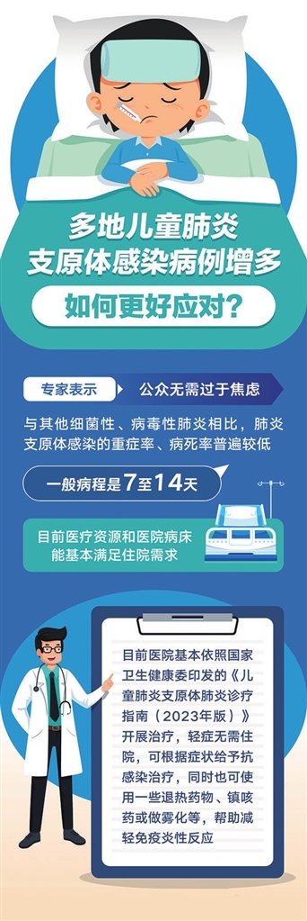 尽管感染人数增加,专家表示公众无需过于焦虑。“与其他细菌性、病毒性肺炎相比,肺炎支原体感染的重症率、病死率普遍较低。一般病程是7至14天,根据病情严重程度与治疗方案会适度缩短或延长。”广州医科大学附属市八医院呼吸内科副主任医师袁伟锋说,“目前医疗资源和医院病床能基本满足住院需求。”