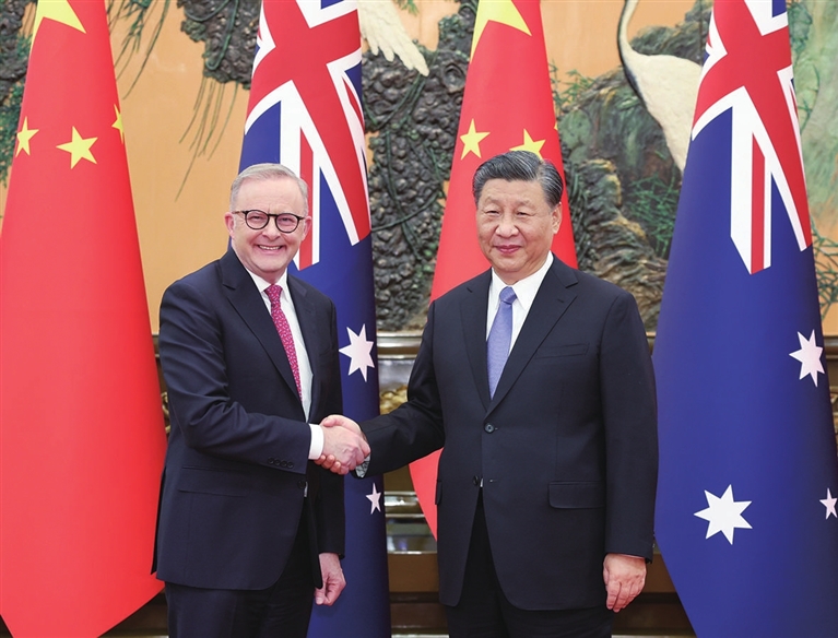 习近平强调,当前,世界经济不稳定、不确定、难预料因素增多,各国经济都面临不小挑战。面对复杂的外部环境,中国经济顶住了压力,稳定了规模,提升了质量,中国发展仍然具有良好支撑基础和诸多有利条件,中国将以自身稳定发展为不确定的世界经济带来宝贵的确定性。中国的发展离不开世界,世界的发展也需要中国。“小院高墙”“脱钩断链”,或者“去风险”,本质上都是保护主义,违背市场规律、科技发展规律,也违背人类社会发展潮流。中国奉行互利共赢的开放战略,推动构建新发展格局,以中国式现代化全面推进强国建设、民族复兴伟业,这将为包括澳大利亚在内的世界各国带来前所未有的机遇。中澳要在和平共处中增进相互理解和信任,在互利合作中实现共同发展。充分发挥中澳自由贸易协定潜能,拓展气候变化、绿色经济等新兴领域合作,维护全球和区域自由贸易体系,为两国企业投资经营提供良好营商环境。两国政府要支持立法机构、政党、智库、青年、地方开展交流,为人员往来创造更多便利条件,增进两国人民相知相亲,筑牢两国友好的民意基础。中国在亚太地区不搞排他性小圈子,不搞集团政治,不搞阵营对抗。小圈子解决不了全球面临的大挑战,小集团适应不了当今世界的大变局。对那些把亚太地区搞乱的企图,我们一是要警惕,二是要反对。中方愿同澳方开展更多三方、多方合作,支持南太平洋国家增强发展韧性,应对气候变化等挑战,在开放包容中维护亚太地区和平稳定。