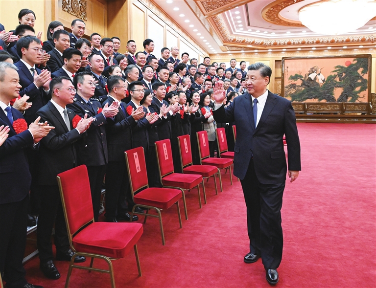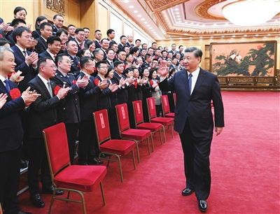 上午10时30分,习近平等来到人民大会堂东大厅,全场响起热烈掌声。习近平等向代表们挥手致意,同大家亲切交流并合影留念。