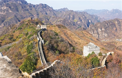 位于天津市蓟州区北部山区的黄崖关长城被秋叶点缀,美景如画。