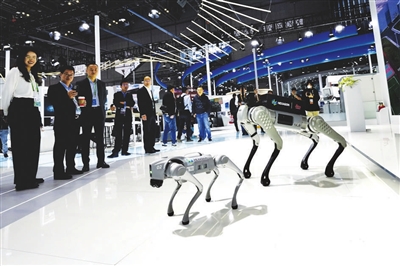 11月7日,在第六届进博会技术装备展区,观众在观看海克斯康展示的智能机器狗。