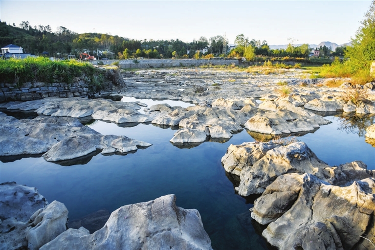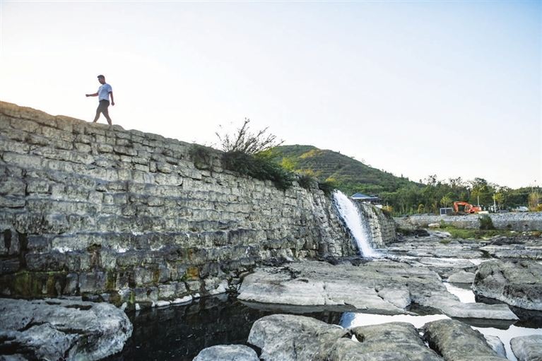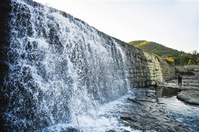11月6日,村民行走在白霓古堰上。