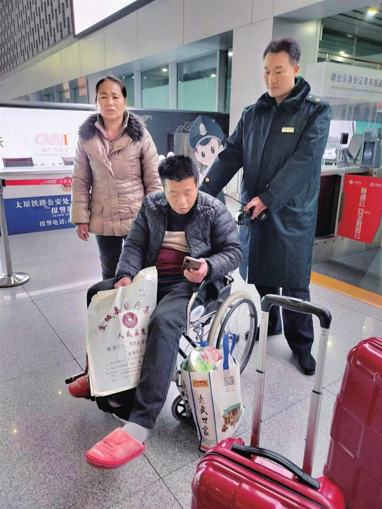 拍摄经过:11月8日,我在太原南站东进站口目睹了温馨一幕:早上6时许,一名男子一瘸一拐走进候车大厅,见状,客运员赵龙急忙上前主动搀扶对方,又找来一把轮椅,推着男子通过安检。经了解,该男子叫石建锋,是安徽来并务工人员。前不久,因摔伤导致左脚脚踝骨折,当天要坐火车回老家做手术。看到这一感人瞬间,想为咱太原南站工作人员的贴心服务点赞。