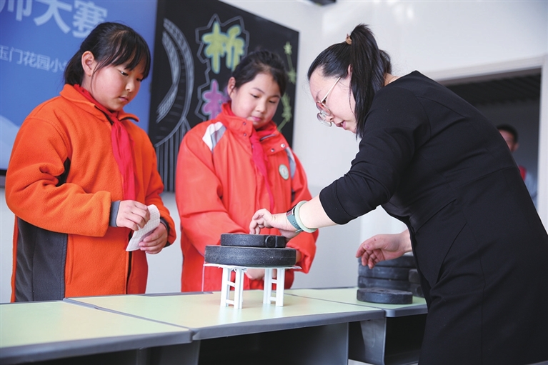 在承重纸桥赛现场,每组孩子最多只能用20张A4纸和普通胶水制作纸桥,折成的纸桥不光有“颜值”,还需要尽可能承受更大的重量。孩子们讨论出方案就开始动手实践,一座座精巧的纸桥逐渐诞生。接下来,老师将一只只杠铃片慢慢叠摞在巴掌大的纸桥上。“10斤、20斤……”赛场上不断响起惊呼声,想不到一座小小的纸桥竟然能承受85公斤的重量。