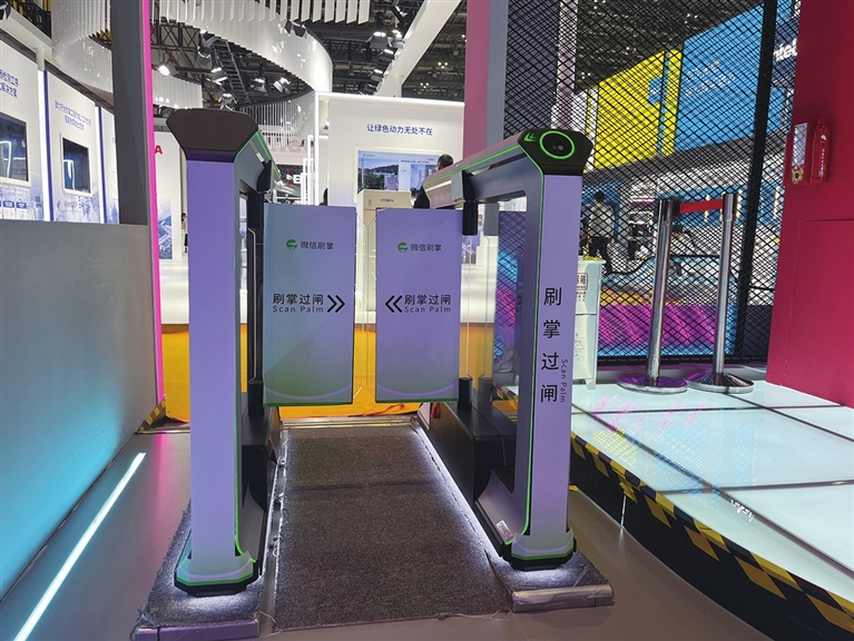 在工作人员提示下,参观者伸出手掌,对准了闸门旁边的圆形图案,随着“嘀”的一声,闸门随即打开,参观者顺利通过。现场工作人员吴卫昊介绍,这种“刷掌”设备可针对不同用户的伸手习惯,进行自动识别,不论平放还是竖放手掌,仪器都能迅速准确识别到本人,可实现使用人群的自然、无感,更符合人体工程学的交互原理,也更易被接受。