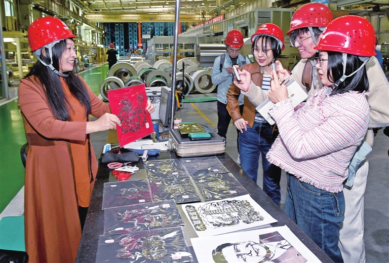 11月12日,中国宝武太钢集团职工家属展示用“手撕钢”制作的剪纸作品。太钢 “手撕钢”以其“薄如蝉翼“的特质和特有的色泽,不仅应用于高端精品制造,还“赋能”传统工艺,用于制作剪纸、鸟尊等文创产品。 王旭宏 摄