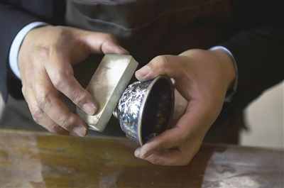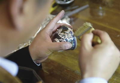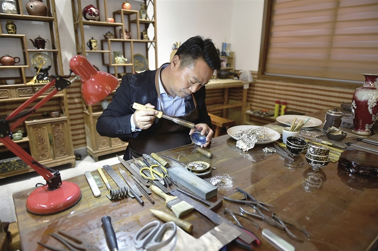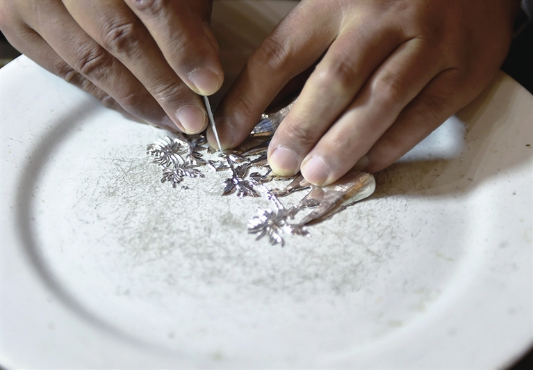 11月9日,李冰在自己的工作室里制作金镶玉作品。