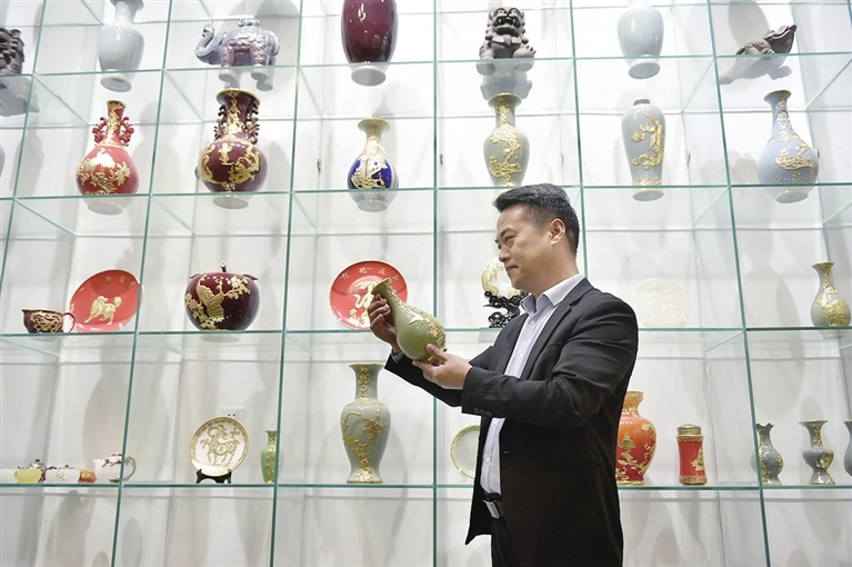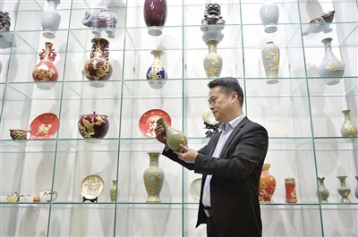 11月9日,李冰在三郎庙村的金镶玉制作技艺研学基地检查展架上的金镶玉作品。