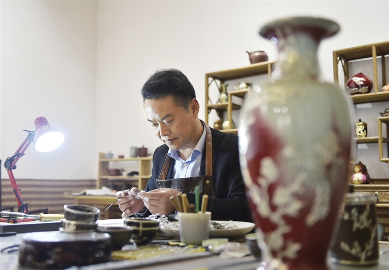 作为非遗技艺传承人,河南省郏县姚庄回族乡三郎庙村的李冰在继承家传技艺的同时,不断探索和改进金镶玉制作技艺的使用材料和工艺技法,在保持传统元素的基础上积极融入时代特色。从艺近30年,其作品多次获奖并远销国内外。近年来,在当地政府的引导和扶持下,李冰所在乡村建立金镶玉产业园区,采用“公司+合作社”的经营模式,通过展会推介、校企合作、研学旅行等多种举措,不仅促进了非遗项目的保护与传承,还带动了周边村民就业,壮大了村集体经济。