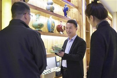 11月9日,李冰(中)在自己的工作室里向来访者介绍金镶玉作品。