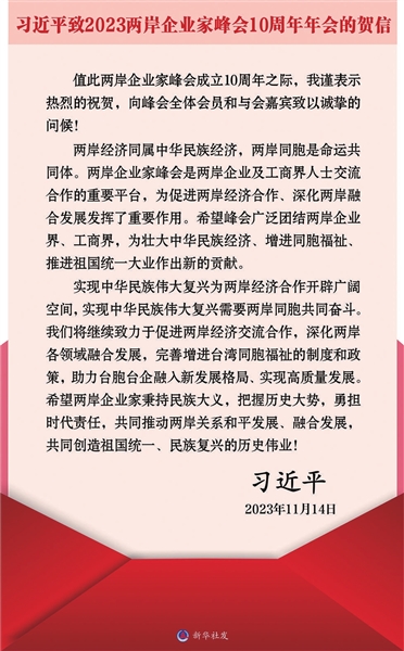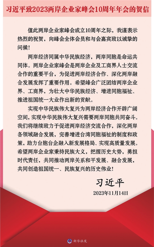 习近平强调,实现中华民族伟大复兴为两岸经济合作开辟广阔空间,实现中华民族伟大复兴需要两岸同胞共同奋斗。我们将继续致力于促进两岸经济交流合作,深化两岸各领域融合发展,完善增进台湾同胞福祉的制度和政策,助力台胞台企融入新发展格局、实现高质量发展。希望两岸企业家秉持民族大义,把握历史大势,勇担时代责任,共同推动两岸关系和平发展、融合发展,共同创造祖国统一、民族复兴的历史伟业。