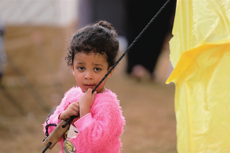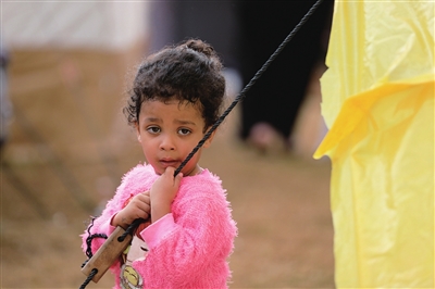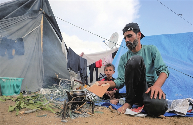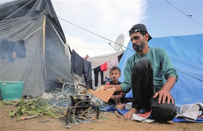 这是11月14日在加沙地带南部城市汗尤尼斯一个临时营地拍摄的流离失所的巴勒斯坦人。