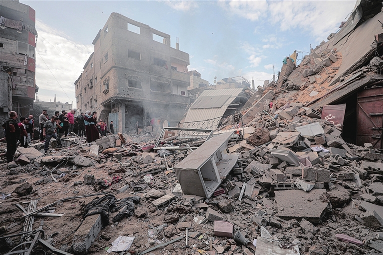 这是11月13日在加沙地带中部地区拍摄的一个遭以色列空袭的建筑废墟。 新华社 发