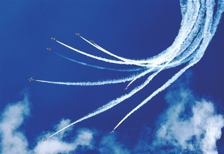 11月13日,意大利“三色箭”飞行表演队在阿联酋迪拜国际航展上进行特技飞行表演。