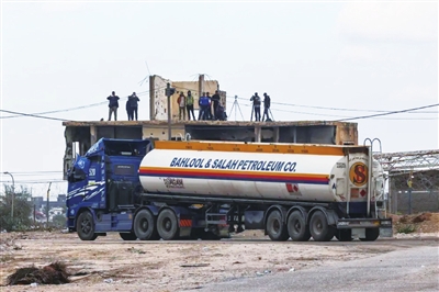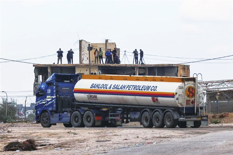 11月15日,在拉法口岸加沙一侧,一辆运载燃料的卡车进入加沙。 新华社 发
