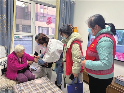 77岁的任大爷是位独居老人,家住青年东街北巷7号铁路宿舍。多年前,他被查出患有尿毒症,需要经常透析。得知社区工作人员和医护人员上门看望,老人的亲属早早等在门口。医护人员先了解老人近期的透析情况,然后熟练地为其进行护理服务。针对老人的病情,医护人员还讲解了居家护理知识和注意事项,并嘱咐有问题可随时打电话咨询。老人家属深受感动,握住护士的手连连称谢。随后,医护人员来到89岁的独居老人张大娘家,为其测量血糖、血压和心率。“我岁数大,有高血压、糖尿病,常年吃药,出门就医难,有你们上门体检,可太方便了,谢谢你们。”张大娘感激地说。当日上午,社区工作人员和医护人员为6位独居、空巢老人提供了上门义诊服务。