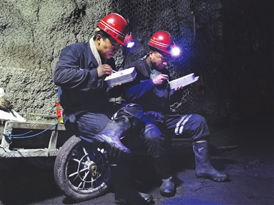9时,边云伟随各队组的送餐工排好队依次走进罐笼,随着铁门缓缓关闭,罐笼开始慢速下降。大约过了3分钟,罐笼缓缓停下。走出罐笼,绕过一条巷道,一条干净明亮的大巷展现在眼前,等待不多时,一列人行车停靠面前,大家鱼贯进入,人行车缓缓地向黑暗中行进,其间人行车不时停靠,各队组送餐工走向各自的目的地……