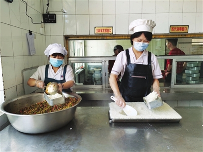 配餐中心用的蔬菜、水果是当日由专门的供货商送来的鲜货,食堂有专业的质量验收小组查收,验收要求袋袋验、筐筐验,并根据蔬果的颜色、大小、气味、整齐度、成熟度、清洁度等标准打分,未经验收的原材料严禁入库。每天一大早,师傅们就开始忙着备菜,从洗菜、削皮、切菜到主食制作全部纯手工,连土豆上的一个小黑点都会被仔细剜掉。
