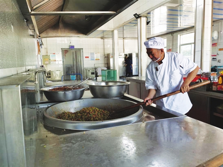 朝天椒、青红椒、萝卜干切丁,猪肉绞馅,梅干菜备用,起锅、烧油、下料、爆炒……扑鼻的香气、诱人的色泽,征服着人们的味蕾。“这外婆菜是湖南湘西地区家喻户晓的家常菜。大锅菜不比小炒,得兼顾大家的饮食习惯,外婆菜里放的青红椒和朝天椒都是我们多次征求意见后,调配好的比例,很受矿工欢迎。”有着高级厨师证的李政权,炒了30多年菜,作为矿配餐中心厨师班班长,他潜心烹饪,只为守住匠心,让井下的矿工兄弟吃上热气腾腾的可口饭菜。