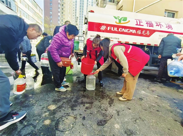 在抢修的同时,社区迅速联系兴华街办环卫所,调派车辆临时供水,保障居民的生活用水需求。“大家不要急,排好队,一个一个来!”午时,送水车驶入小区,居民们拿着自备的水桶、盆盆钵钵,排着长队,依次有序取水。