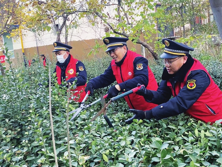 修剪树枝需要专业的工具,执法队借回了一批专业剪刀。16日下午2时30分,该队20余名党员即奔赴该院开展义务志愿服务——修剪绿化带灌木。经过两个半小时的努力,他们共修剪清理了院内大约800平方米杂草丛生的绿化带灌木,同时对小区内散落的枯枝败叶和杂物一并进行了清理。居民大妈们看到志愿者们冒着寒风为大家排忧解难,纷纷端出热茶热水,请志愿者们喝水暖身。