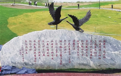 雁丘园中央有一座大的景观石碑,上雕塑双雁齐飞,下镌刻《雁丘词》全文,我们不由地诵读起来。当年元好问所垒的“雁丘”,经800多年的沧桑,早已不知踪迹,但他创作的《雁丘词》及大雁忠贞殉情的感人故事却流传千古,尤其是词中的“问世间、情是何物,直教生死相许”,更是成为象征忠贞爱情的千古名言。