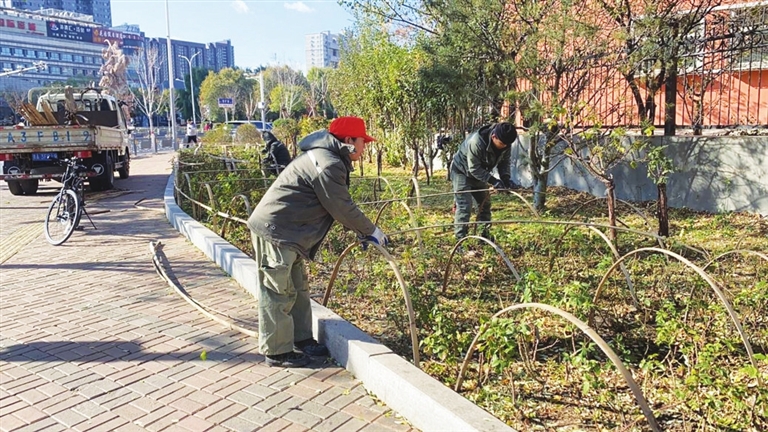 11月21日,万柏林区的绿化带中,园林工人正拿着剪刀忙碌。他们根据月季的生长发育特点,清除细弱枝、枯枝、病枝,并适当疏枝保证良好通风,有目的地培养花枝。通过精雕细刻,使得月季植株造型美观又能适时开花,与周围环境协调,增强园林美化效果。