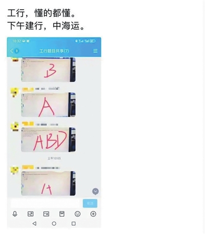 “付款、进群、等答案、结束。”按卖家的说法,代考流程并不复杂,“所有人题目都一样,小范围顺序不一样,完全来得及操作。”