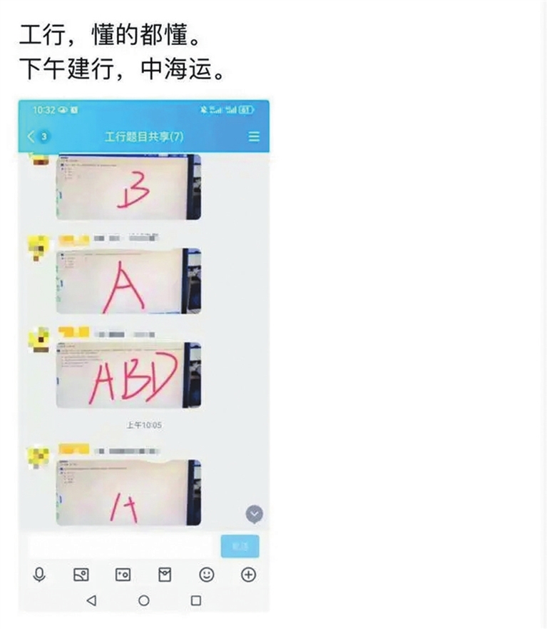“线下笔试是在机房里面进行的,从今年的几次笔试来看,考场内老师监考非常松散,用手机、手表非常容易。比如××银行和××能源线下笔试,客户从头到尾把100多道题完全拍出来了。”具体如何操作,另一名卖家觉得无需多言,“既然要zuobi(作弊),那就自己也想一想办法。我们可以保证的是到时候正常发答案,线下如何看答案自己解决。可以用手表看答案,也可以提前将手机藏好,或者开考后借上厕所的机会拿手机。如果解决不了,或者太害怕不敢做,就不建议上车了。团队只负责做题,不负责其他事情。”